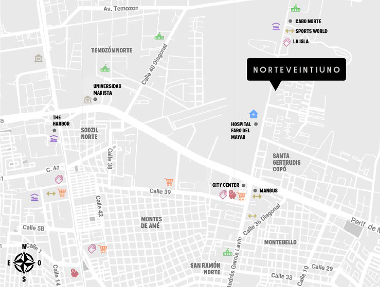 Situado en la zona más privilegiada de la ciudad de Mérida, NORTEVEINTIUNO está sobre la Av. Cabo Norte que conecta con zonas comerciales, servicios generales y otras avenidas principales de la ciudad. Su ubicación permite agilizar la movilidad, y tener acceso a un estilo de vida lleno de comodidad y lujo.