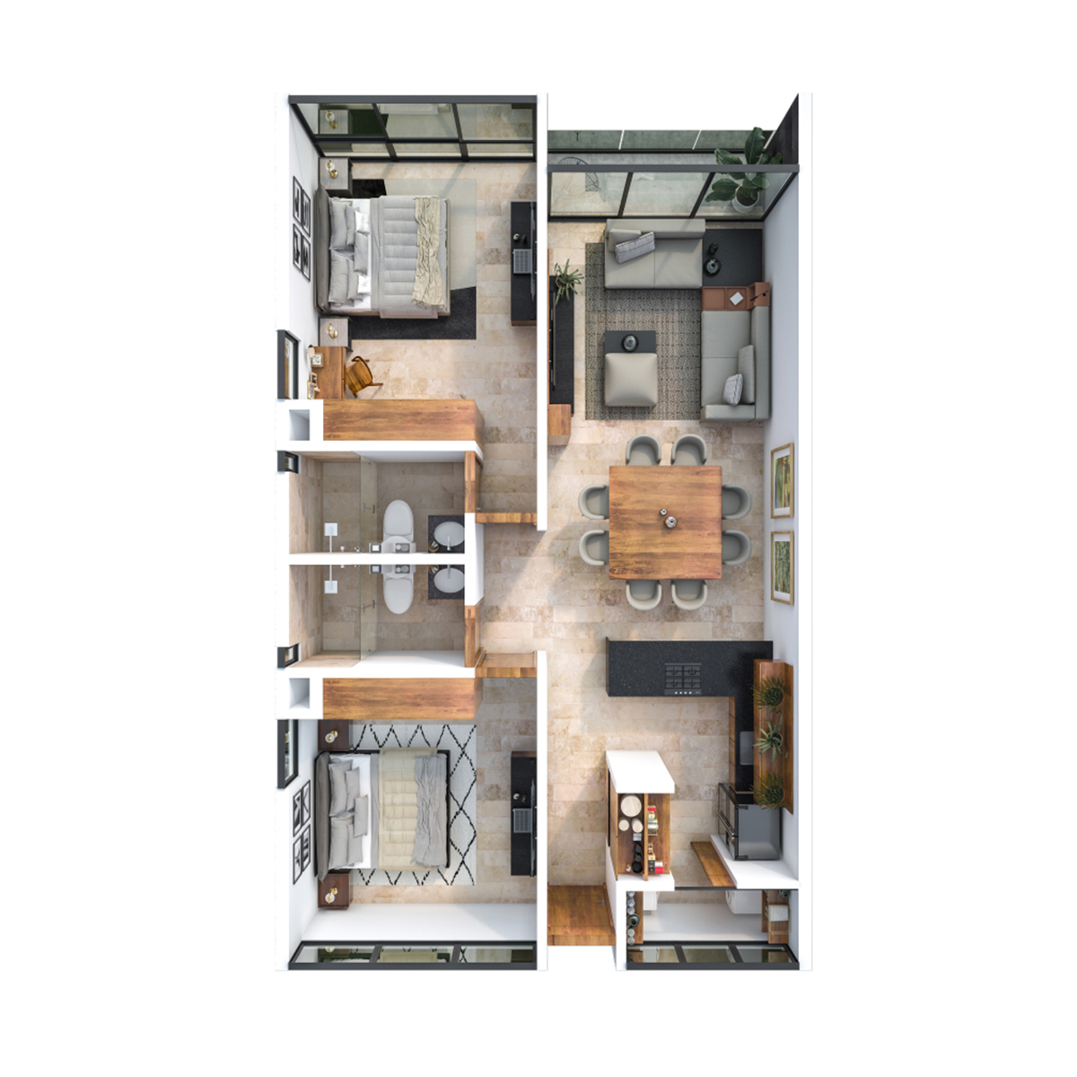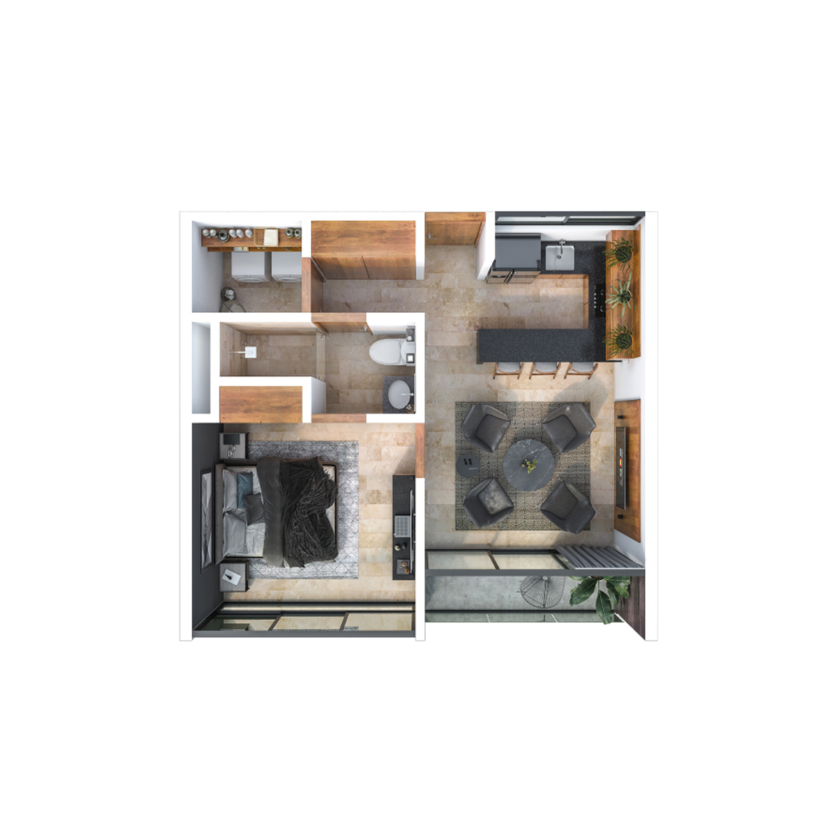 Este desarrollo inmobiliario vertical tiene dos torres con 48 departamentos de tres tipos: 1, 2 y 3 recámaras.