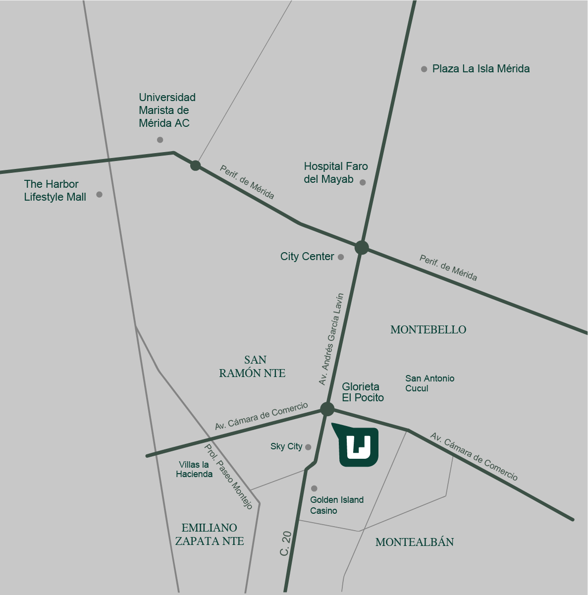 Ubicado en San Antonio Cucul sobre la Av. Andrés García Lavín, Vivero está en una zona residencial de alta plusvalía, a pocos minutos de las dos plazas comerciales más grandes de Mérida, además de universidades, hospitales y servicios generales